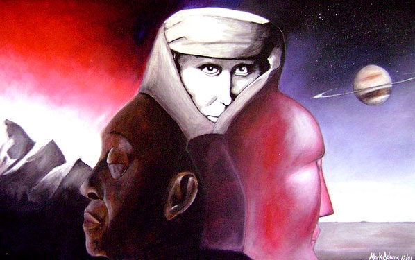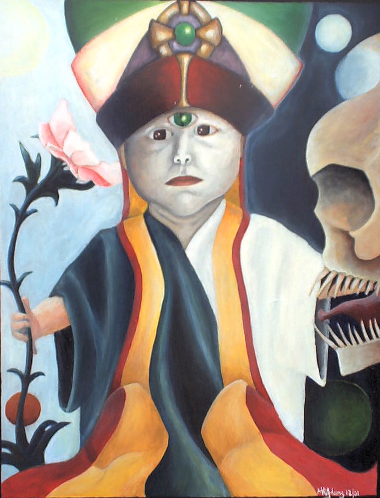 Gnosis, featured in the painting is the feminine aspect of a male at an individual level, communicating repressed features to the male ego-consciousness of the particular individual at that moment in time. Gnosis has revealed herself in mythical form in the individual’s psyche, although she may take many forms and change shape and form throughout time within the individual. She takes many forms in modern collective culture and sub-cultures, showing the state of the collective mind, culture, or sub-culture within that group. If the culture, sub-culture or group is out of balance, it will be up to the individual to correct his or her own original nature and balance. If not, and the individual’s cultural inheritance is unhealthy, the individual may be plagued with visits from hostile and tormenting entities in dreams and visions, revealing itself as an opposition to their own selves, which unfortunately can express itself in the physical world, with conflict on many levels, which is evident in the the world we live in now.